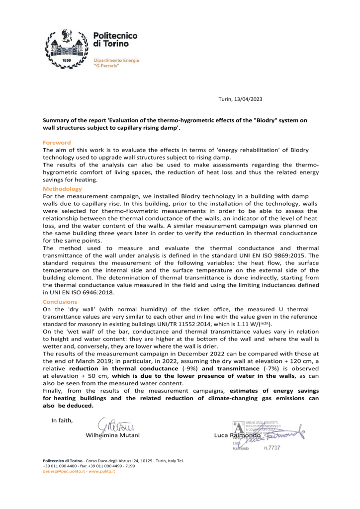 A torinói Politecnico di Torino 2023-as vizsgálata tudományosan igazolta, hogy a Biodry technológia hatékonyan csökkenti a kapilláris nedvességtől érintett falak víztartalmát, ami jelentős termo-higrometrikus javulást eredményez. Az UNI EN ISO 9869:2015 és 6946:2018 szabványok szerint végzett mérések alapján a falak termikus vezetőképessége 9%-kal, hőátbocsátási tényezője pedig 7%-kal csökkent három év alatt, ami a nedvességtartalom mérhető csökkenésének tudható be. Ezek az eredmények igazolják a technológia energiatakarékosságra és hőveszteség-csökkentésre gyakorolt pozitív hatását, és hozzájárulnak az épületek komfortjának, valamint a fűtési energiahatékonyságának javításához.